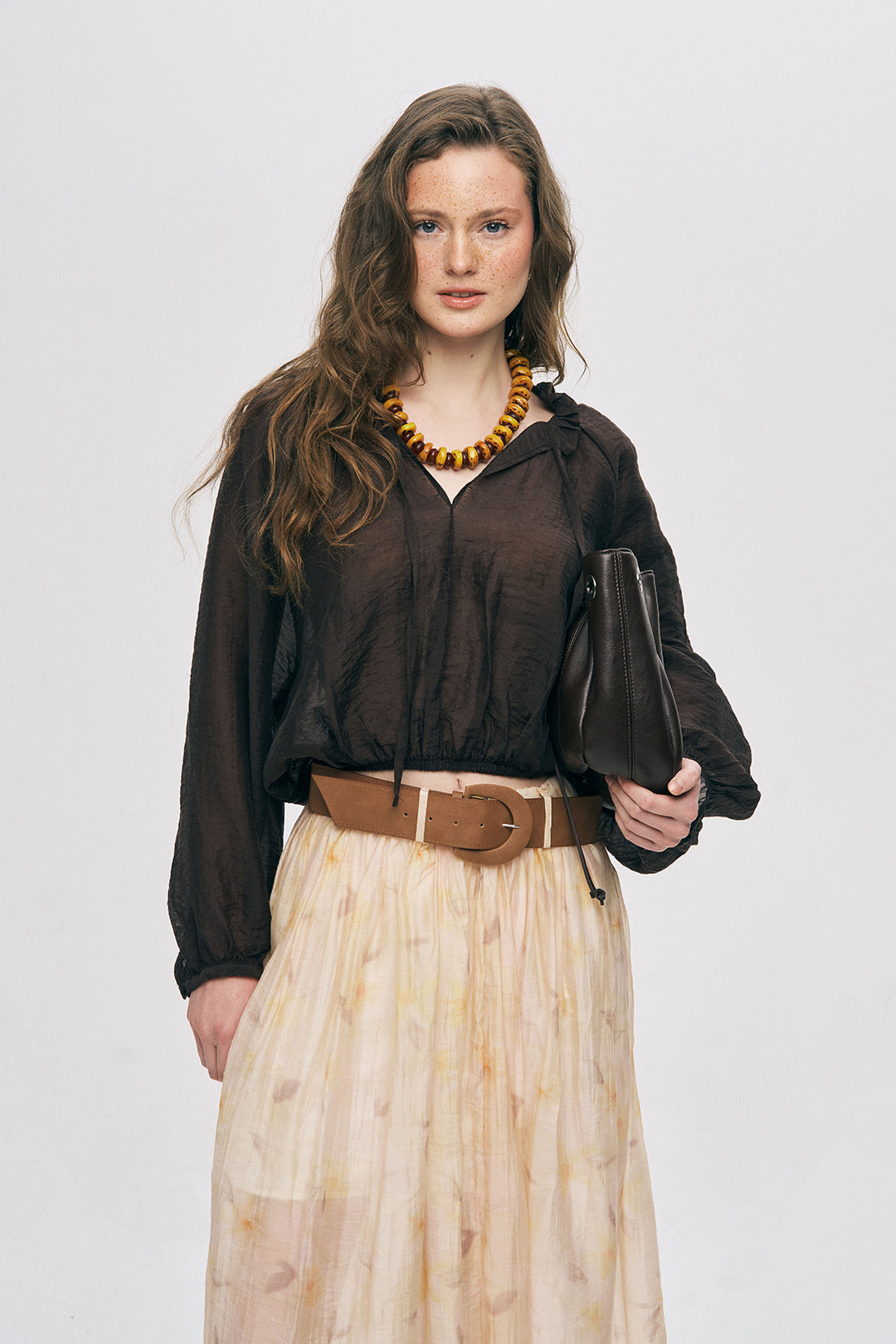 Vurgulanan Bel Hattı: Beldeki lastikli büzgü detayı, bluzu hareketlendirirken vücut formunu zarifçe ortaya çıkarır.