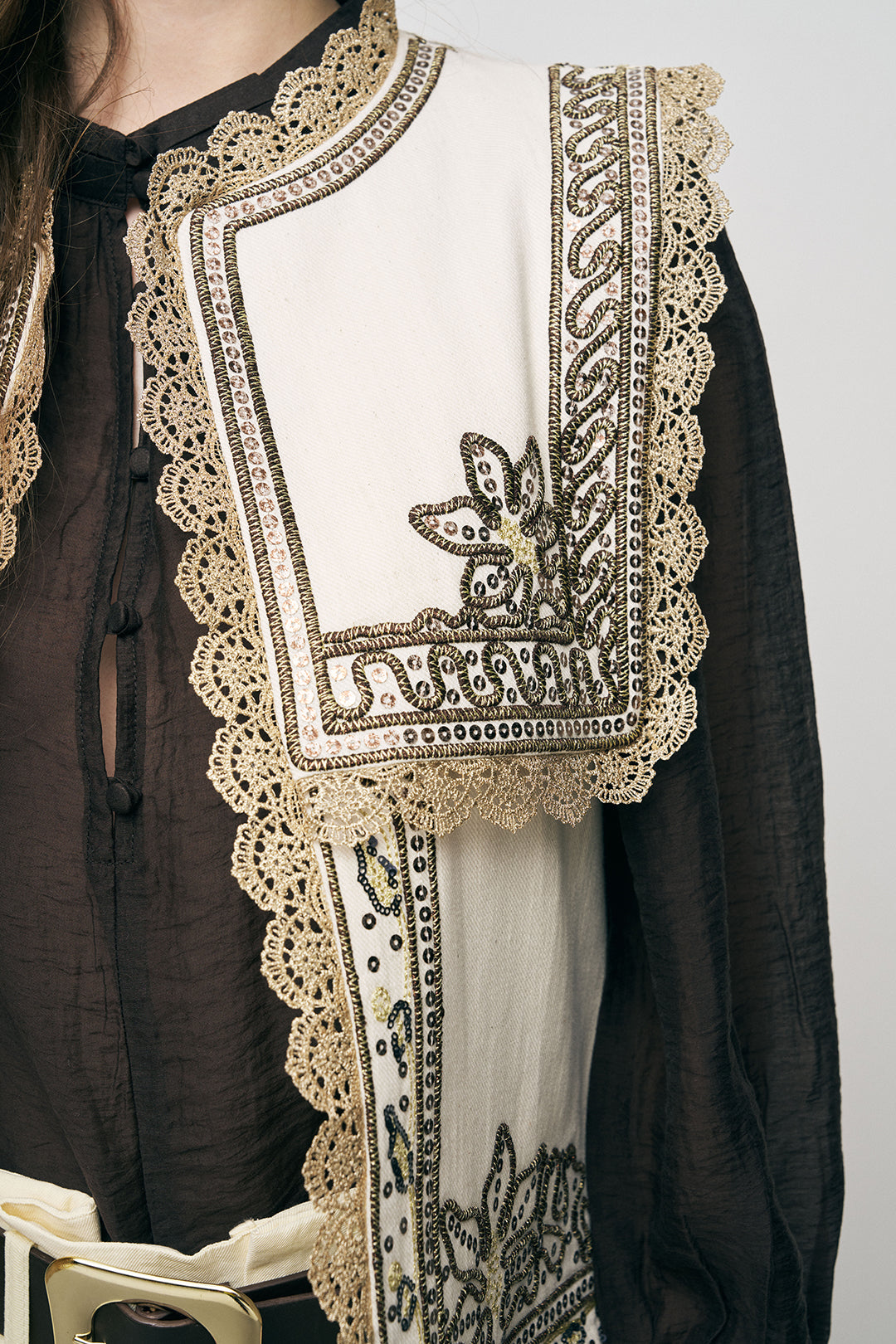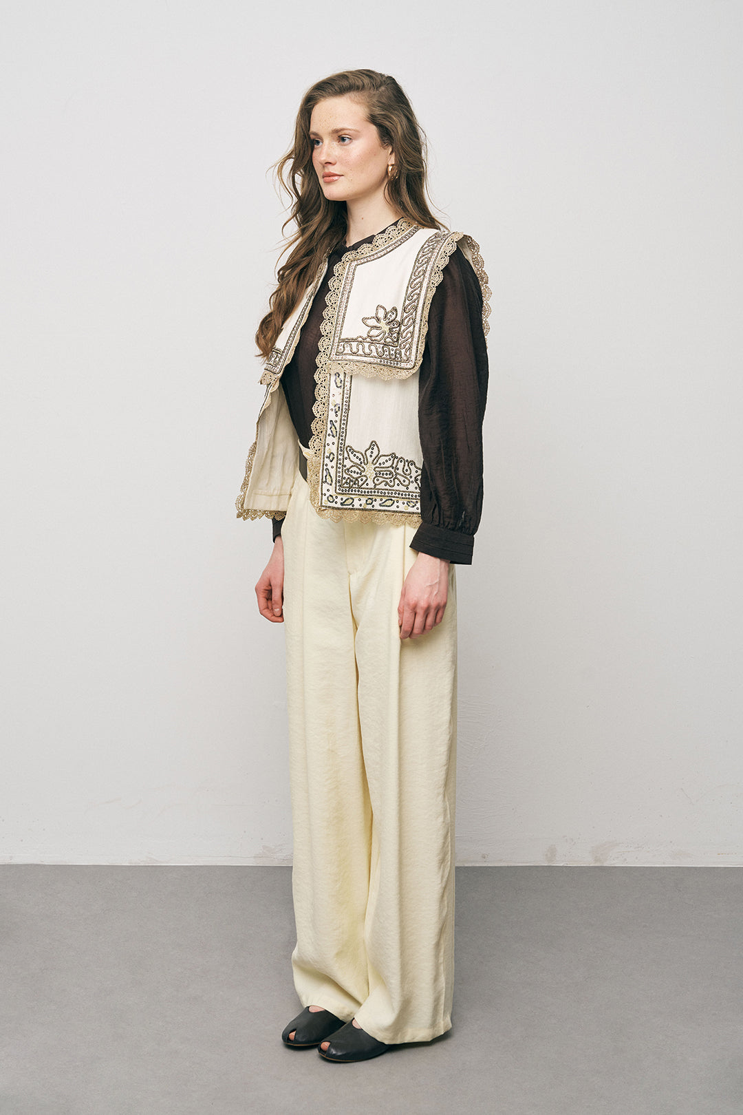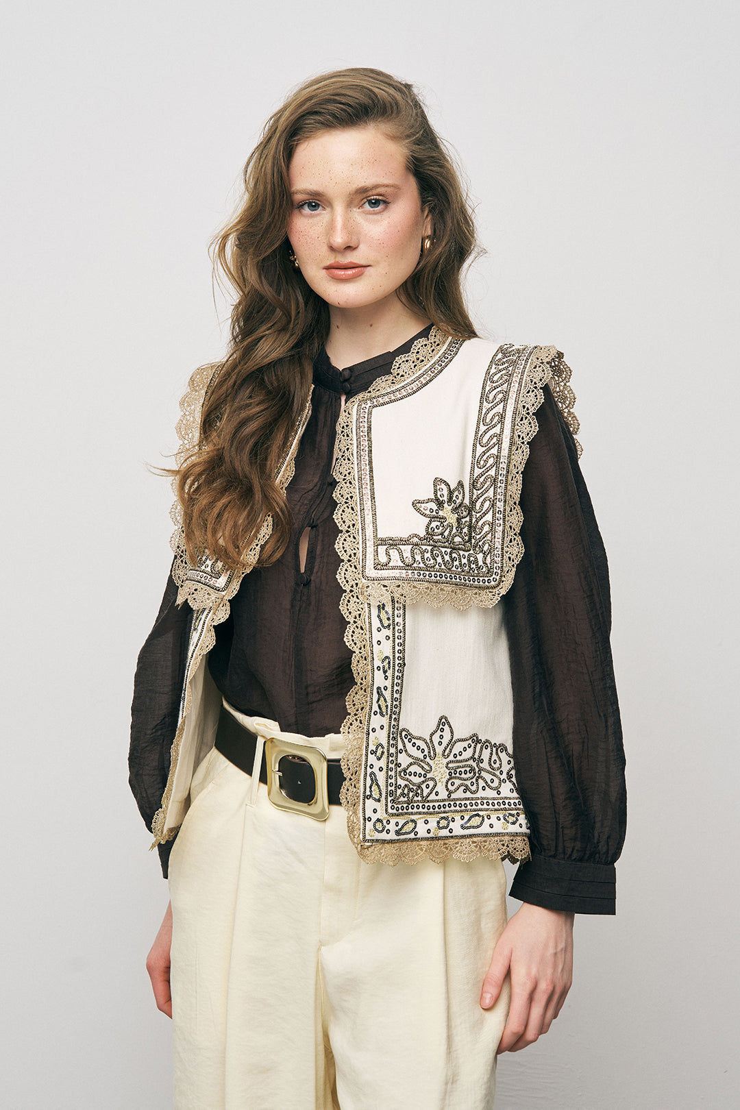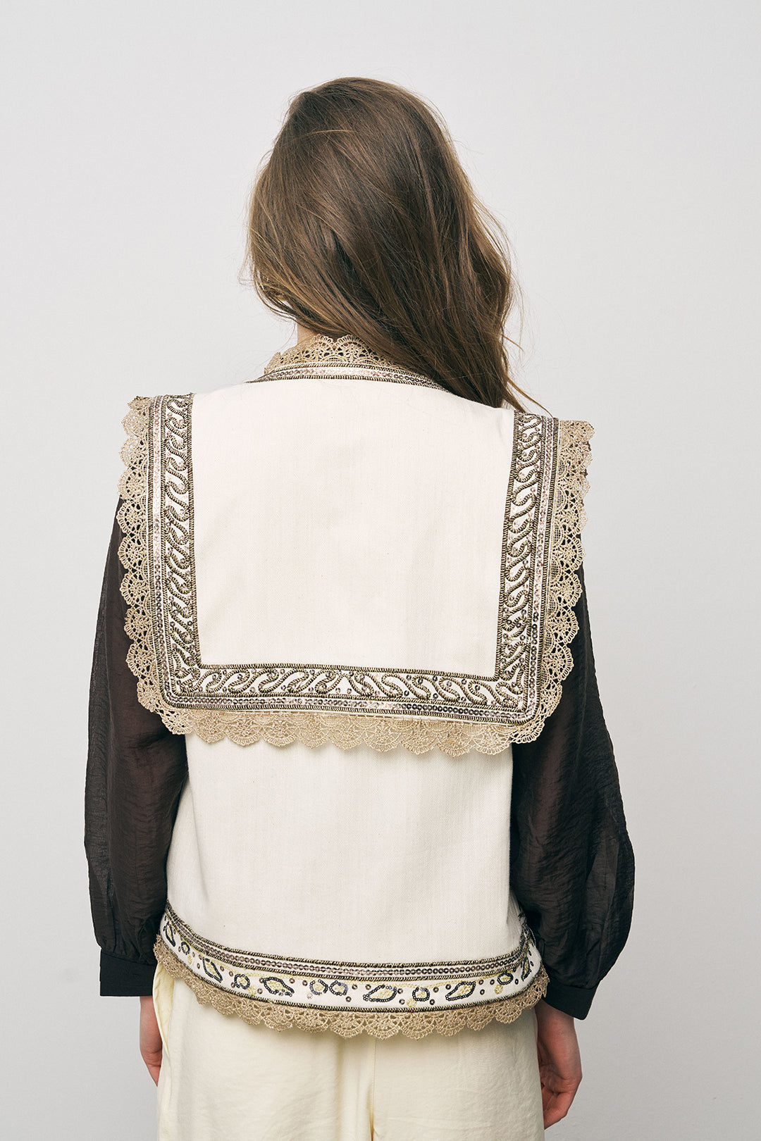 Türkiye’de kendi üretim tesislerimizde yüksek kalite standartlarıyla hazırlanan bu yelek, doğal tonu ve dikkat çekici geniş yaka tasarımıyla modern bir şıklık sunar. Üzerindeki özel işleme detayları ve kontrast dantel bitişleri, klasik yelek formuna lüks ve zanaatkar bir dokunuş katar. 2026 "yelek-ceket" trendine uygun olarak tasarlanan bu parça, mimari kesimiyle stilinize güçlü bir karakter kazandırır.