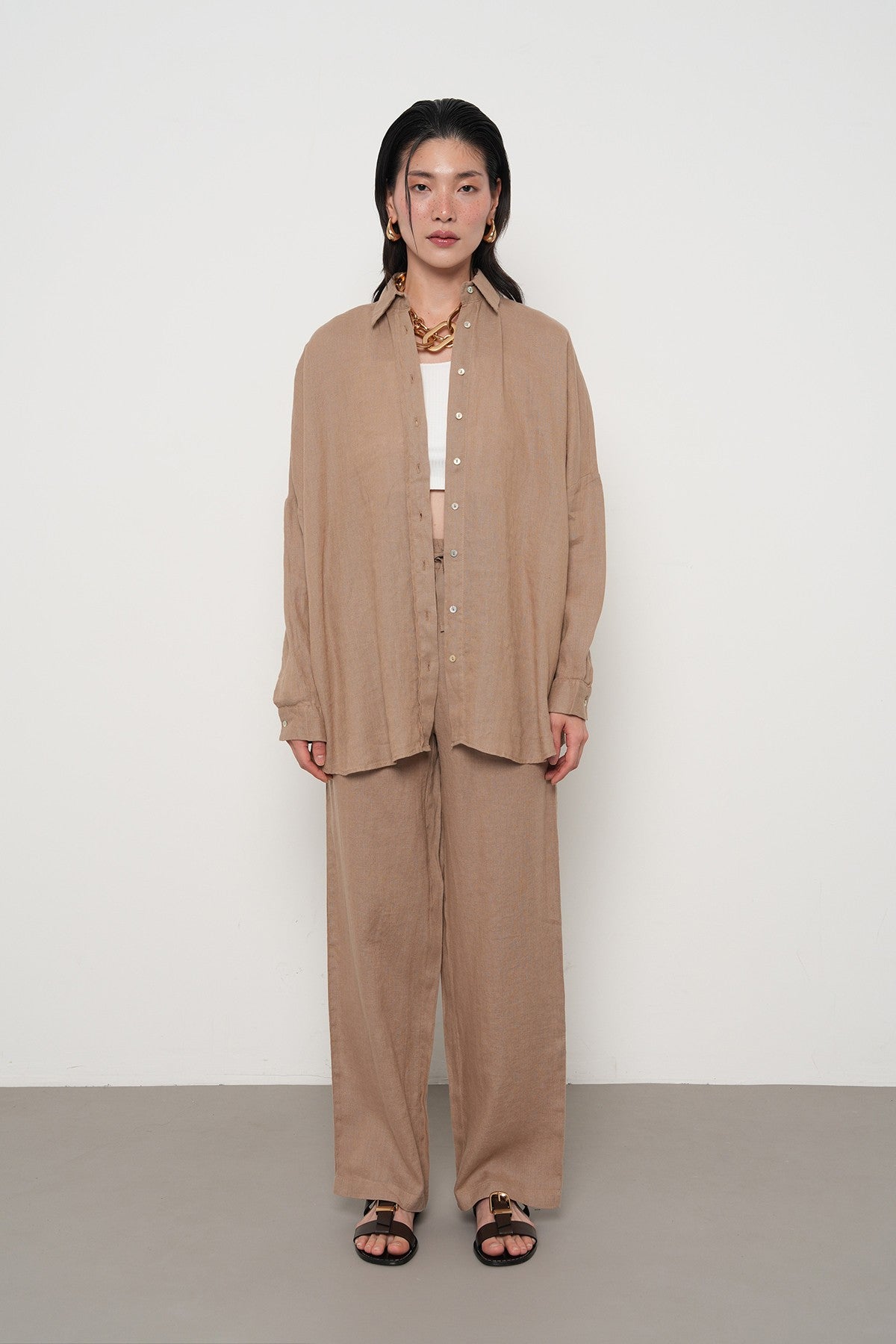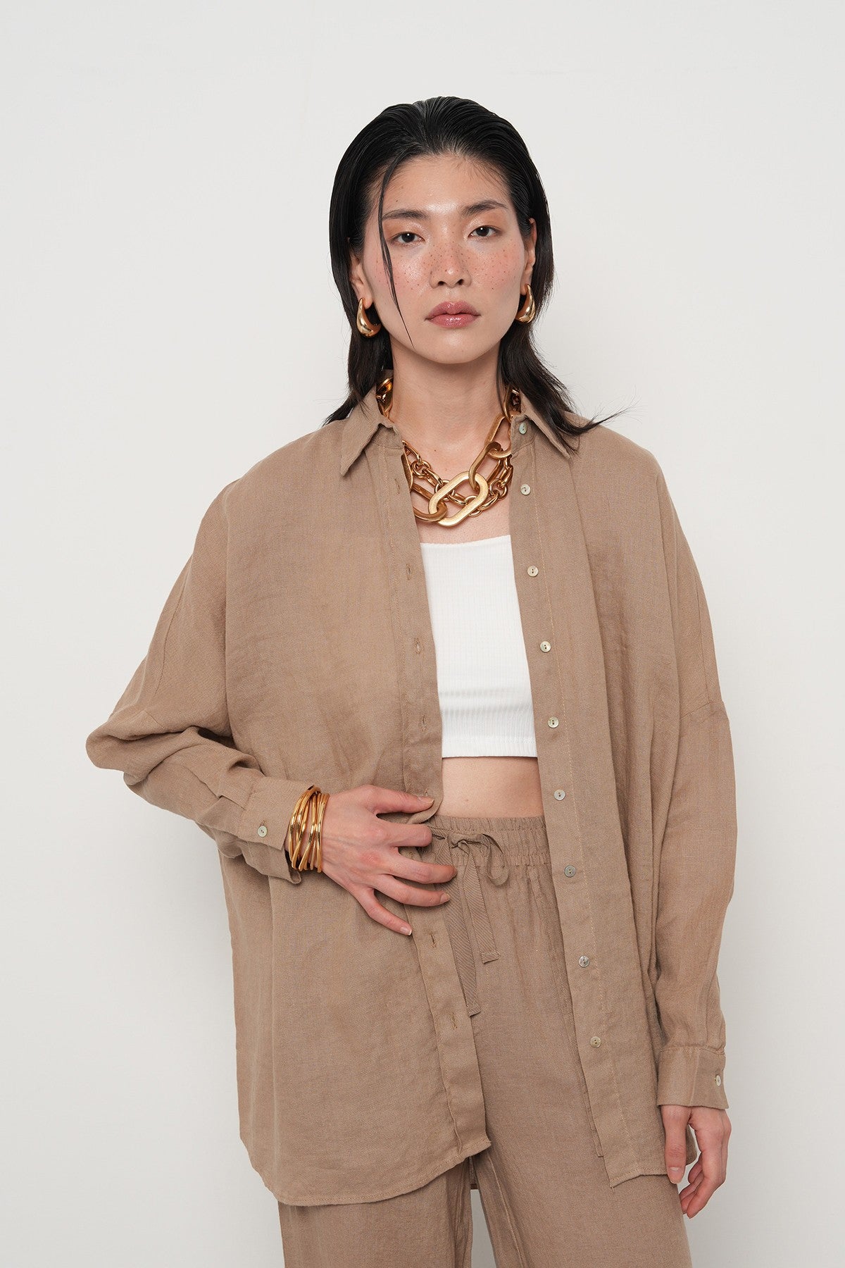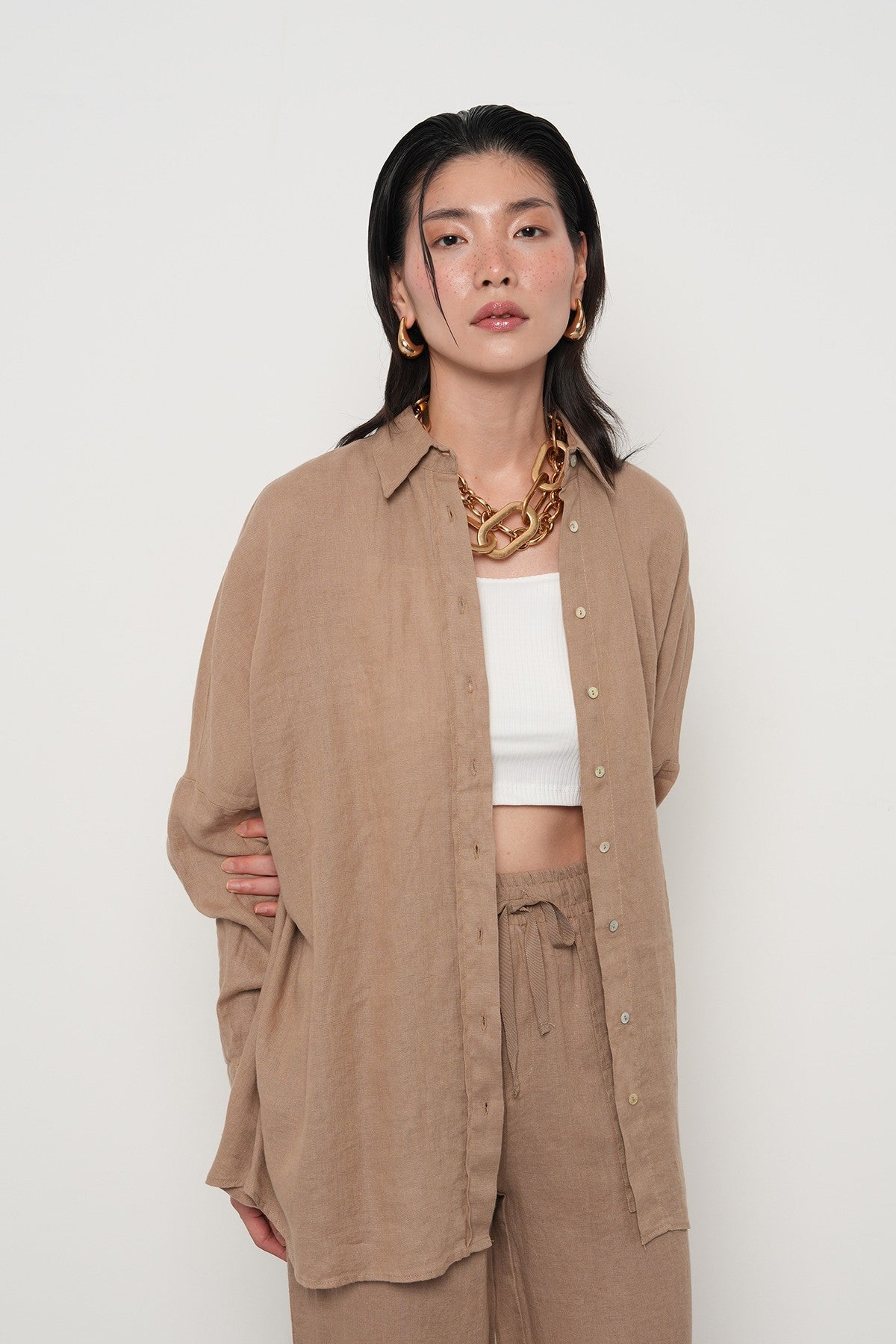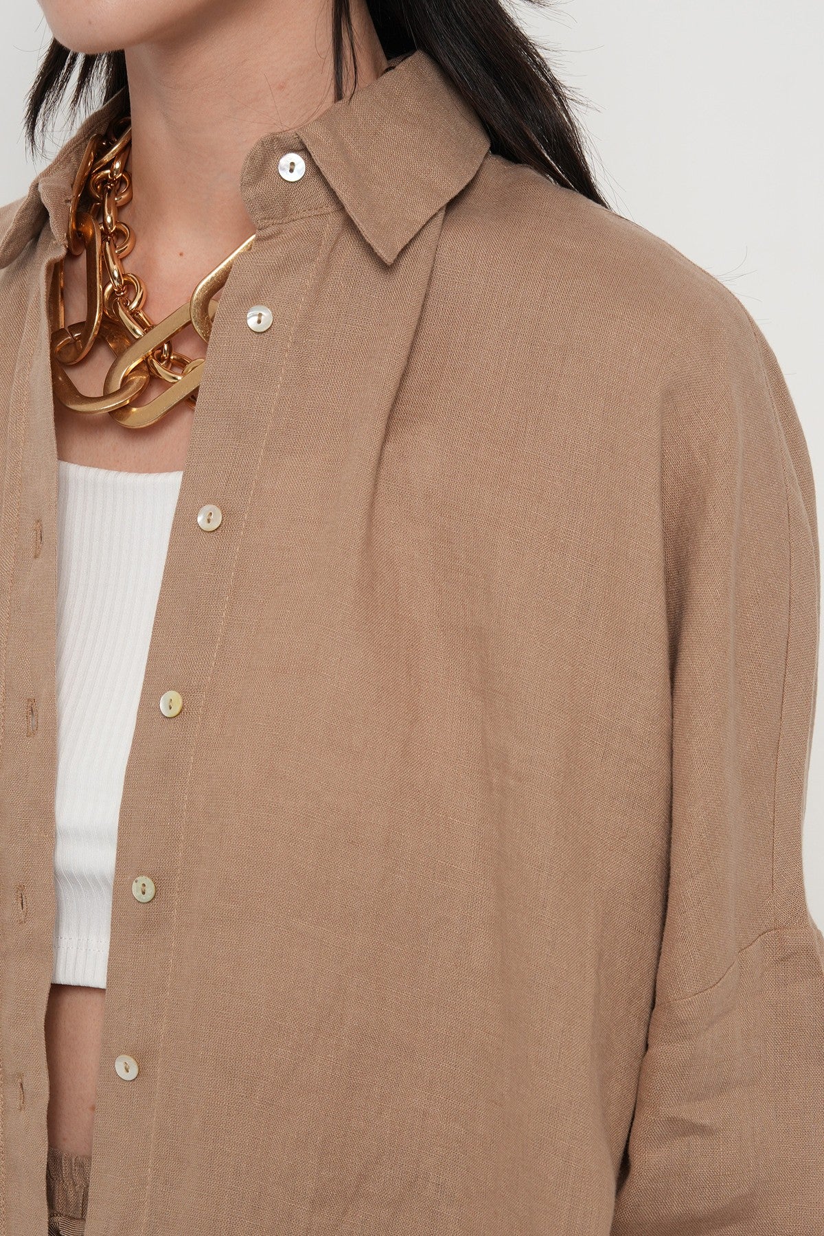 KADIN %100 KETEN YARASA KOL DÜZ OVERSİZE GÖMLEK
